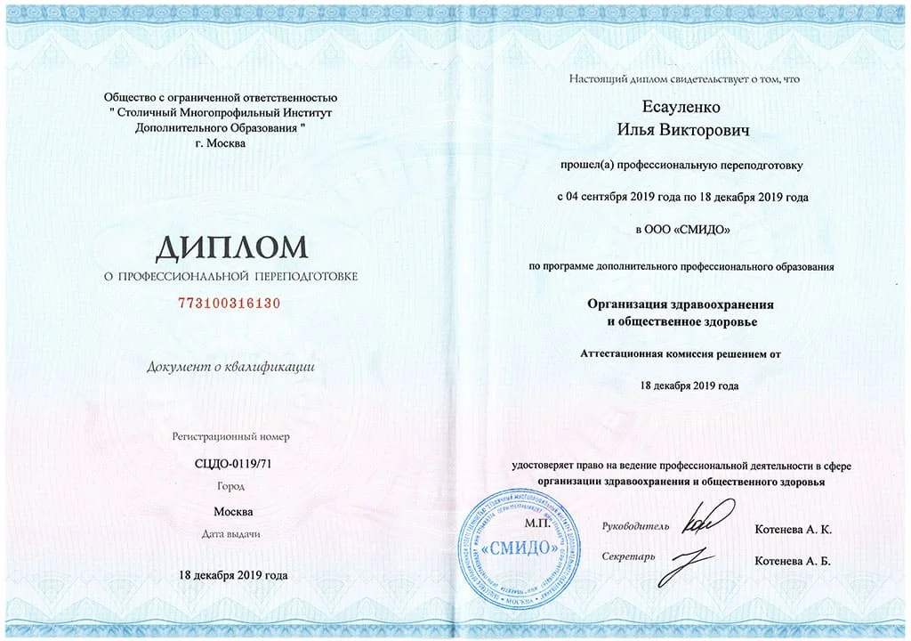 Диплом о профессиональной переподготовке по программе "Организация здравоохранения и общественное здоровье" 2019 год